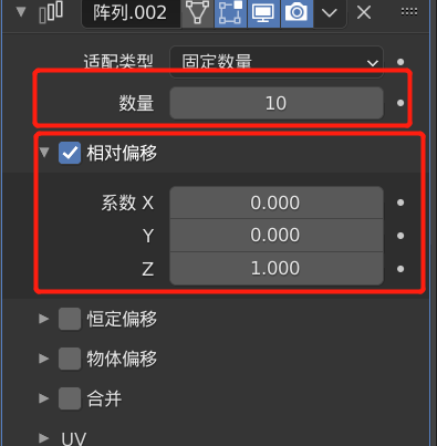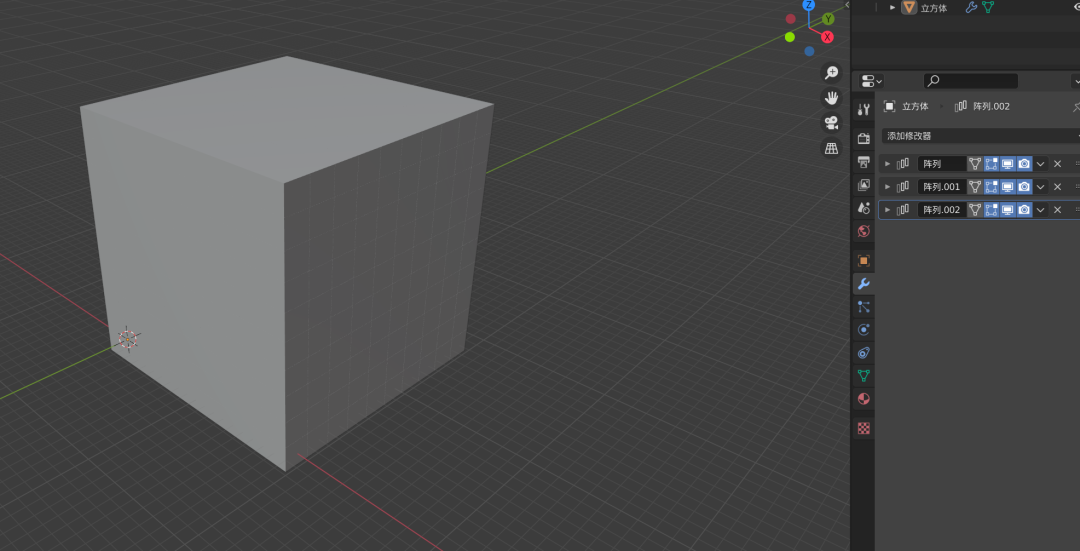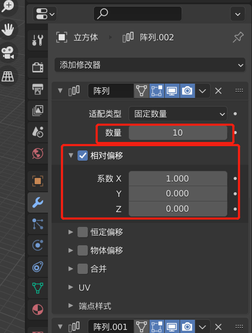 接下来给这个立方体,添加**三个阵列修改器**,这三个修改器分别让其在 X,Y,Z 方向进行复制 10 个,这三个阵列修改器的设置见下图,第一个阵列修改器的相对偏移,系数 X 设置为 1.00