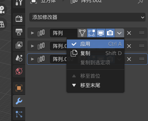 分别将三个阵列修改器进行应用,注意这里一定要在物体模式(如果有一些小伙伴发现自己无法应用可能是在编辑模式,按 Tab 就可以来回切换)