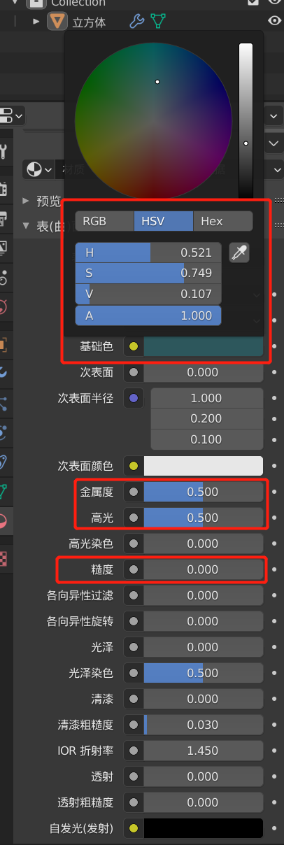 材质添加可以参考,颜色大家可以自己选择,其余的金属度、高光及糙度可以参考下图,不会添加材质的可以参考【Blender 科研绘图】案例 4 - 纳米阵列