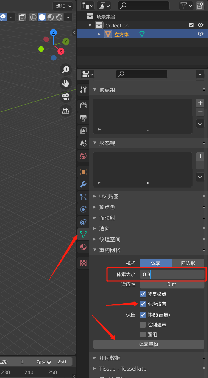 [[重建网格]]-体素大小 建议设置为 0.3,太小可能会很卡,这里计算量比较大,可能要等一会,勾选平滑法向之后,再点击体素重构
