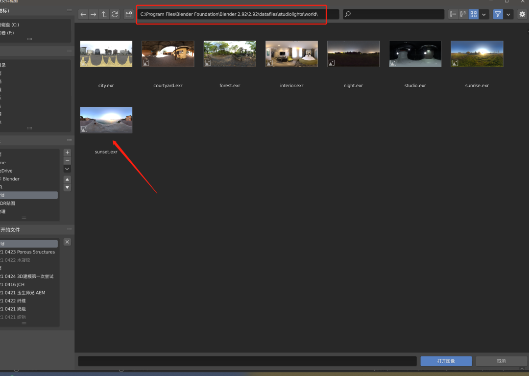 打开一个 HDR 贴图,这个 HDR 贴图是 Blender 自带的,路径见下图