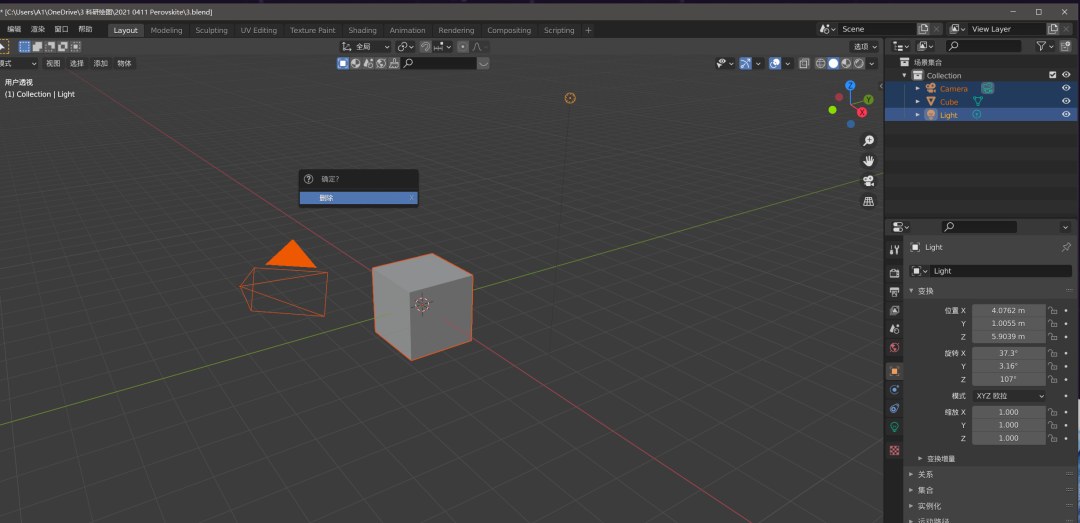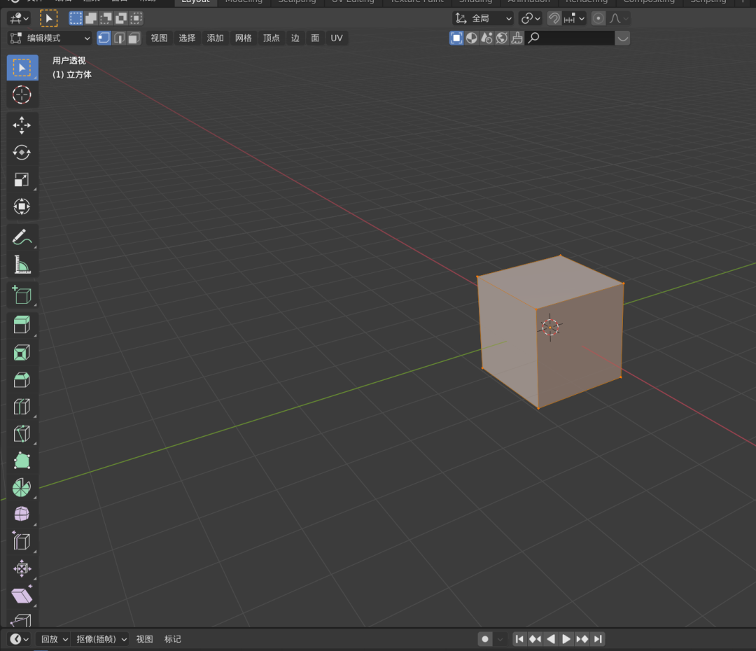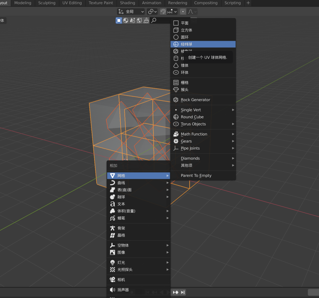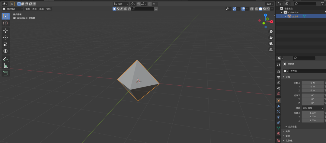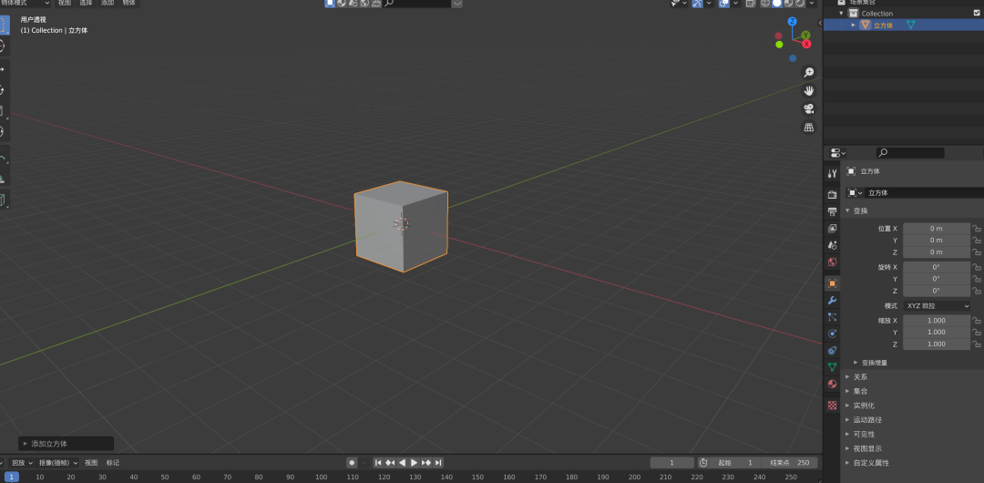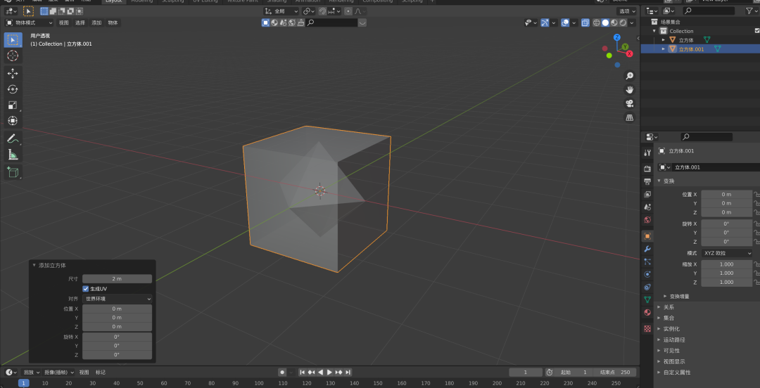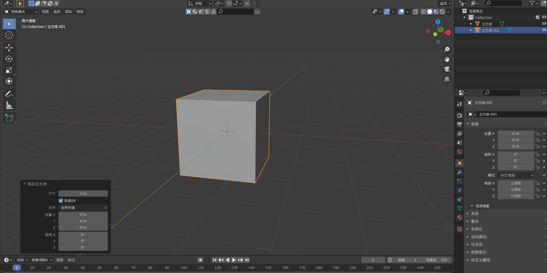 好了之后,我们按 Tab 进入物体模式,然后按 Shift+A 添加一个新的默认立方体