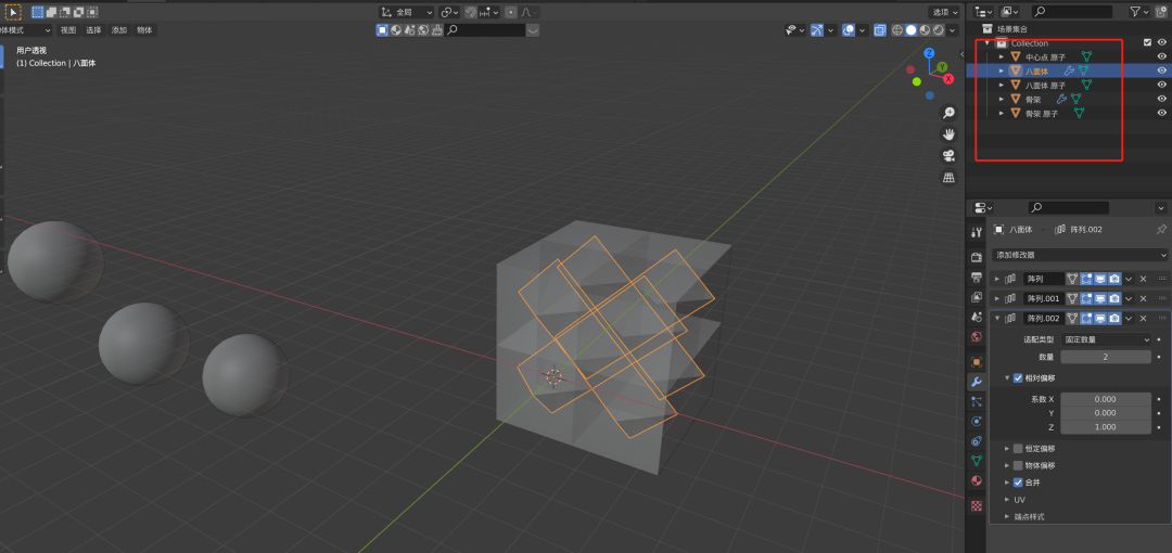 阵列修改器设置完成之后,我们想让八面体也使用同样的修改器,该如何操作呢?我们先选中八面体,然后按 Shift 加选复制好的立方体