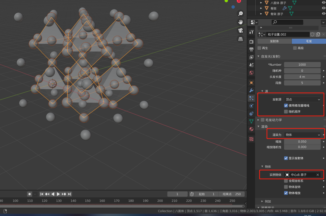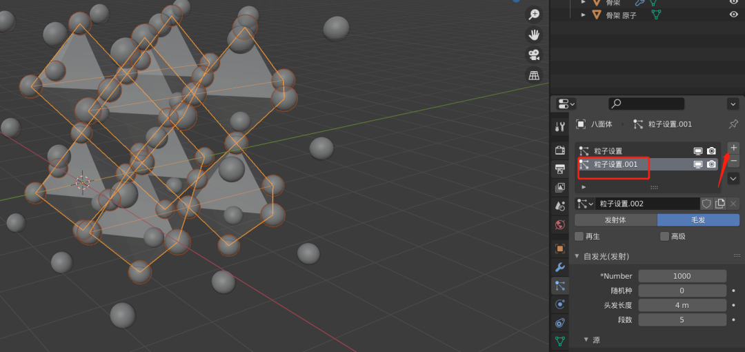 我们给八面体的边缘顶点设置了小球,我们要继续给八面体的中心添加小球,那么我们选择八面体,然后按下图添加另外一个粒子设置即可,还是选择毛发,设置也还是一样,只不过物体选项要选择‘中心原子’(‘中心原子’‘八面体原子’‘骨架原子’其实就是不同的经纬球,这是为了方便之后上色所以才需要赋予不同的原子)