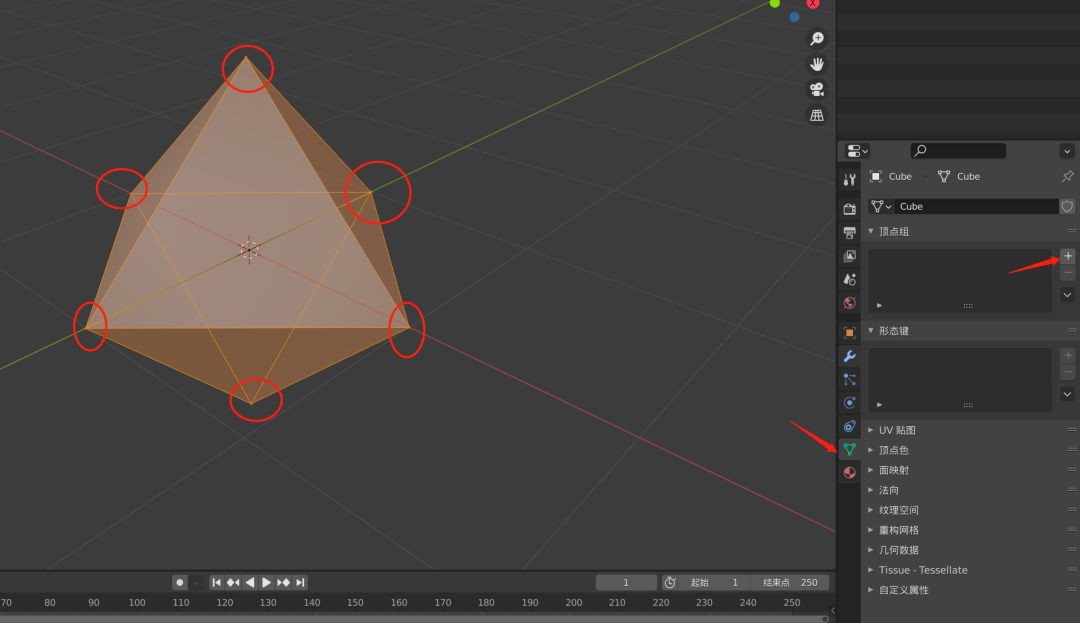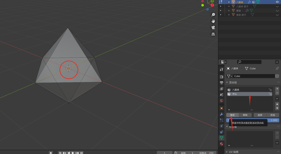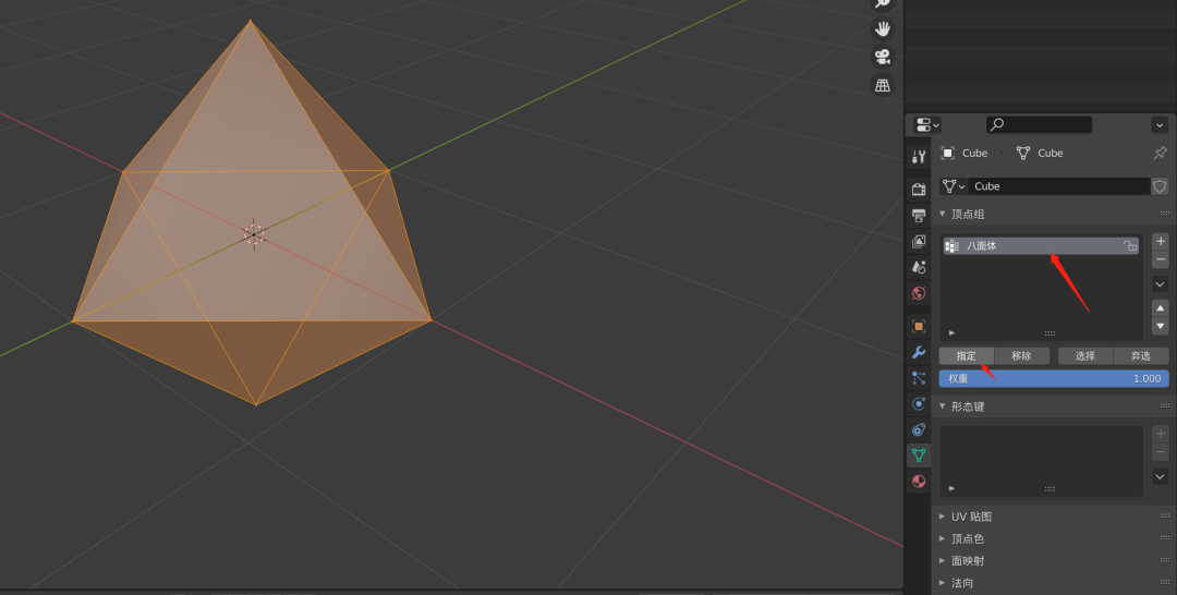 选择好这些点之后,在下图所示的位置添加一个顶点组,然后将其重命名为‘八面体’,然后选择指定,以后我们想快速选择这六个顶点,就直接在顶点组里点选择即可