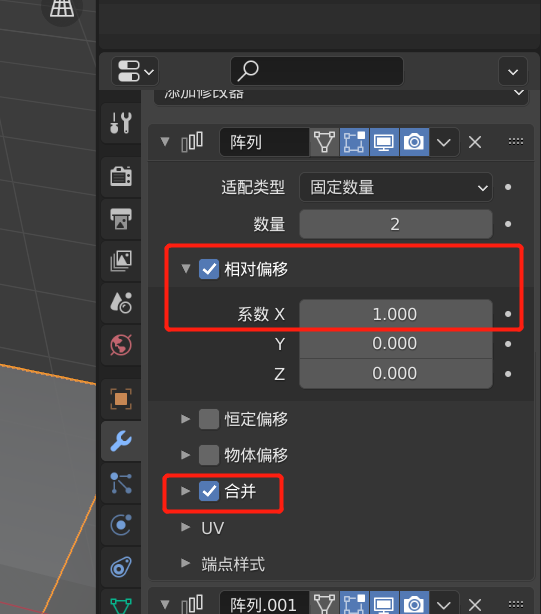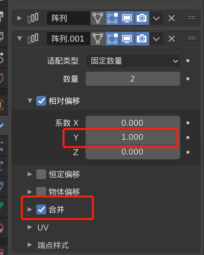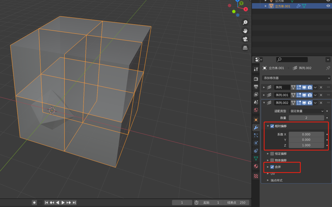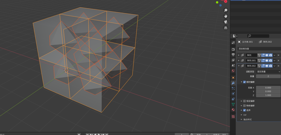 然后分别按下图来设置,让其在 X 方向,Y 方向,Z 方向进行复制,数量看自己想要几个重复单元,但是越多的话生成的点和面将会很多,大家根据自己的电脑来设置,我这里设置为 2 来给大家演示,这里要注意的是必须将三个阵列修改器的合并勾选,因为阵列复制的时候,相交的地方点和线是重合的,勾选合并可以让重复的点合成为一个,这样减少了点和面,也防止模型出错