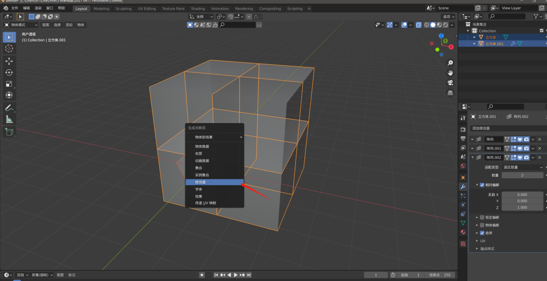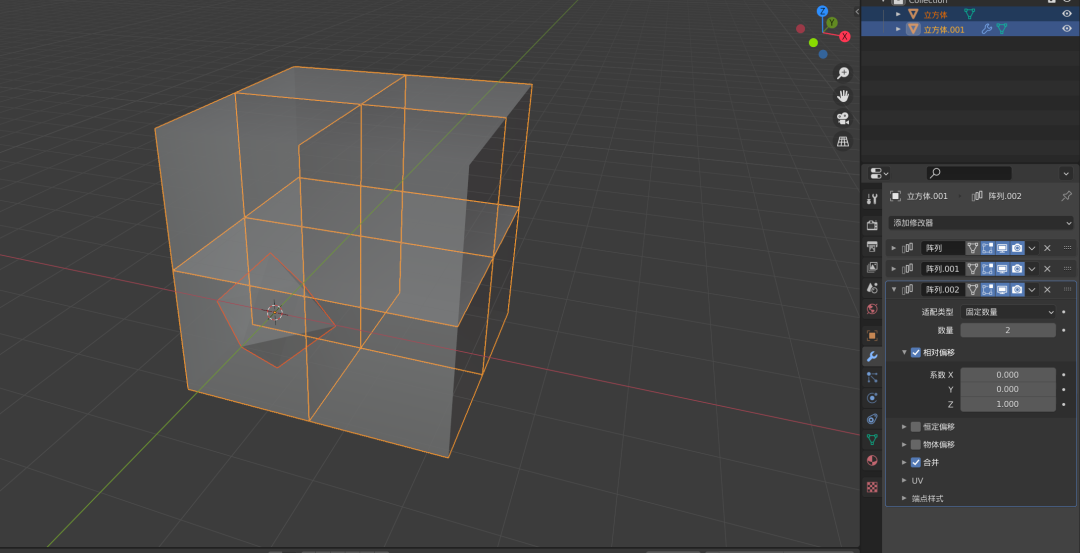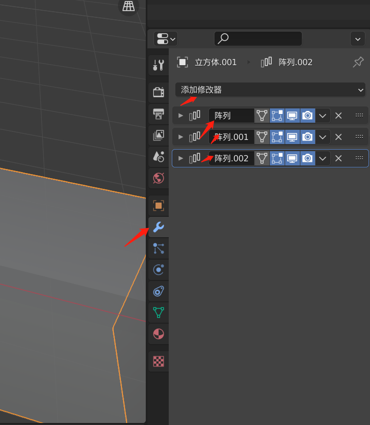 然后选择立方体,按下图所示,给立方体添加三个阵列修改器
