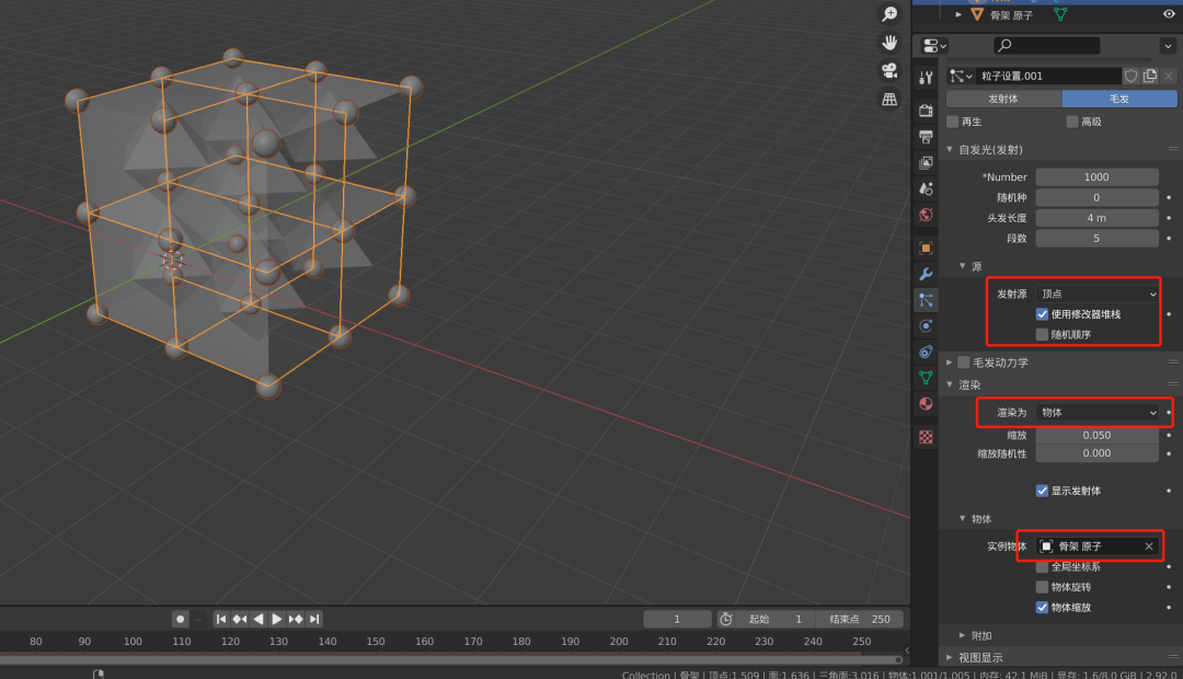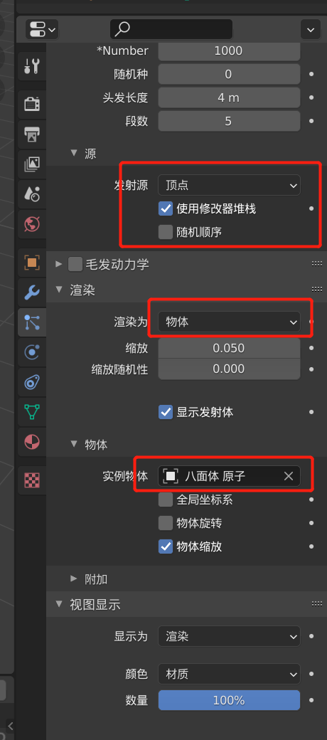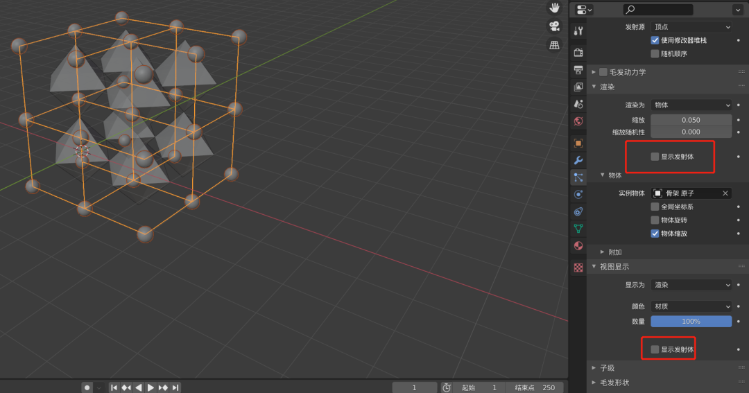 设置见下图,可以看到除了最后选择的实例物体不一样,其他基本大同小异,不过这里**不需要**取消勾选‘显示发射体’(发射体就是我们选择的正八面体和正方体框架)