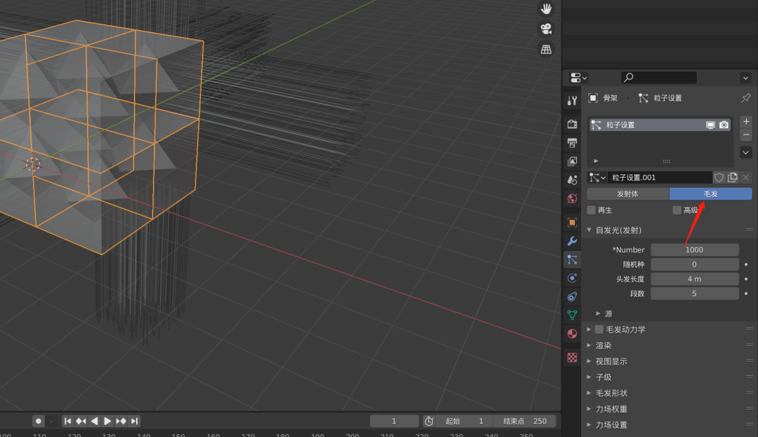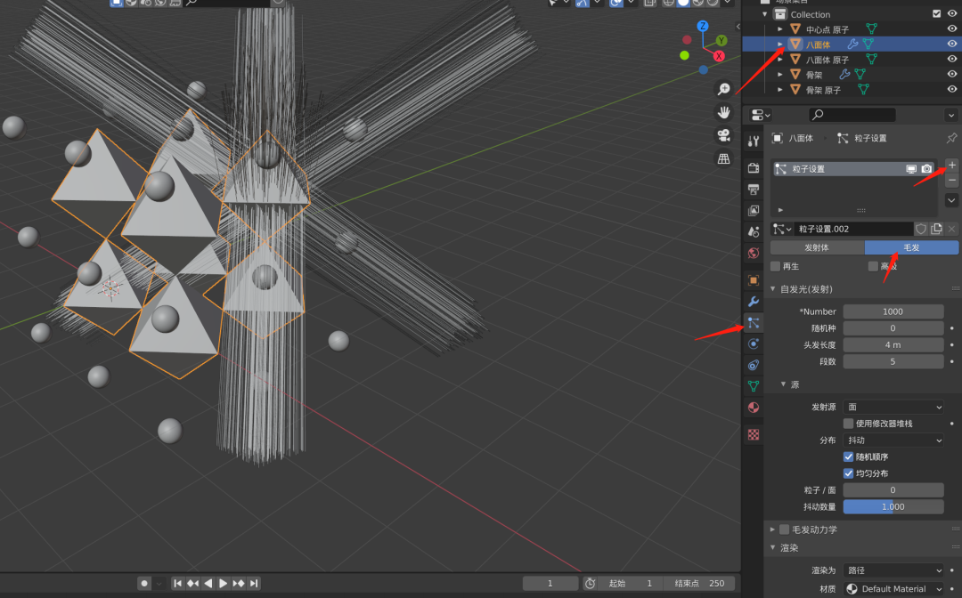然后选择八面体,同样的添加粒子设置,选择毛发