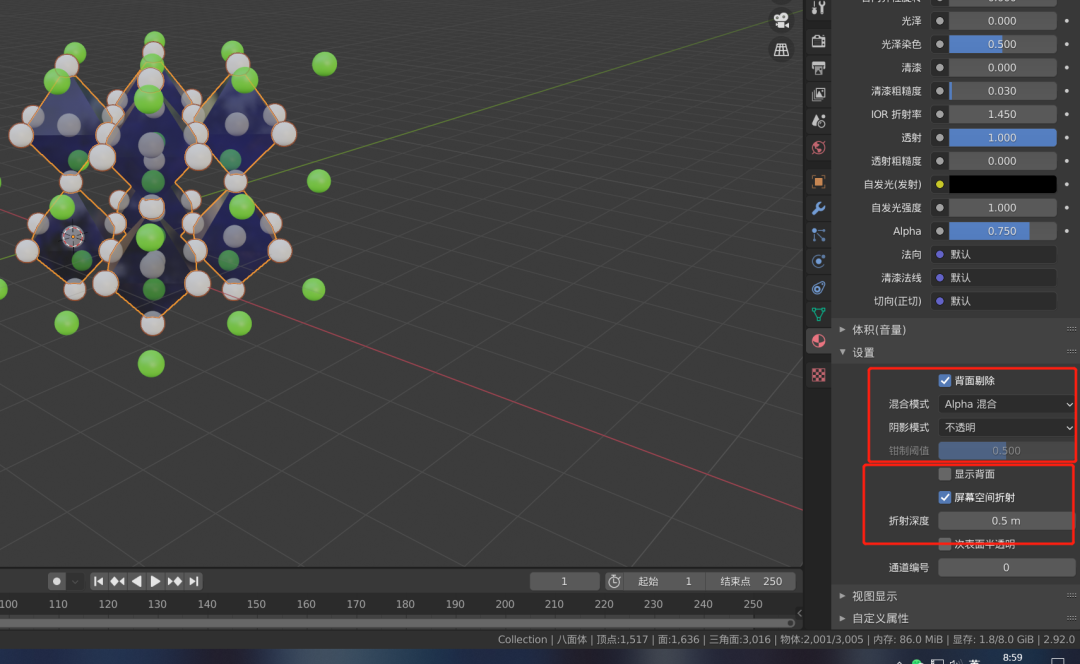 然后选择八面体,对其基础色进行修改,将粗糙度设置为 0,这样其表面就成了镜面光滑了,然后将透射设置为 1,这样光就可以穿过并且有折射效果,将 Alpha 设置为下图所示,Alpha 表示的是透明度,我这里设置为 0.75。这里要注意,透射和 Alpha 不太一样,透射的参数可以控制光透过并使材质的折射发生改变,而 Alpha 仅仅是改变透明度,这里大家可以选择自己觉得合适的效果