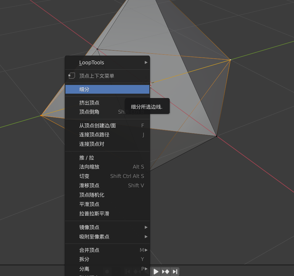 然后右键-细分(这么做的目的是为了让这两个连线的中点出现一个新的点,后面大家就知道为什么这么做了)