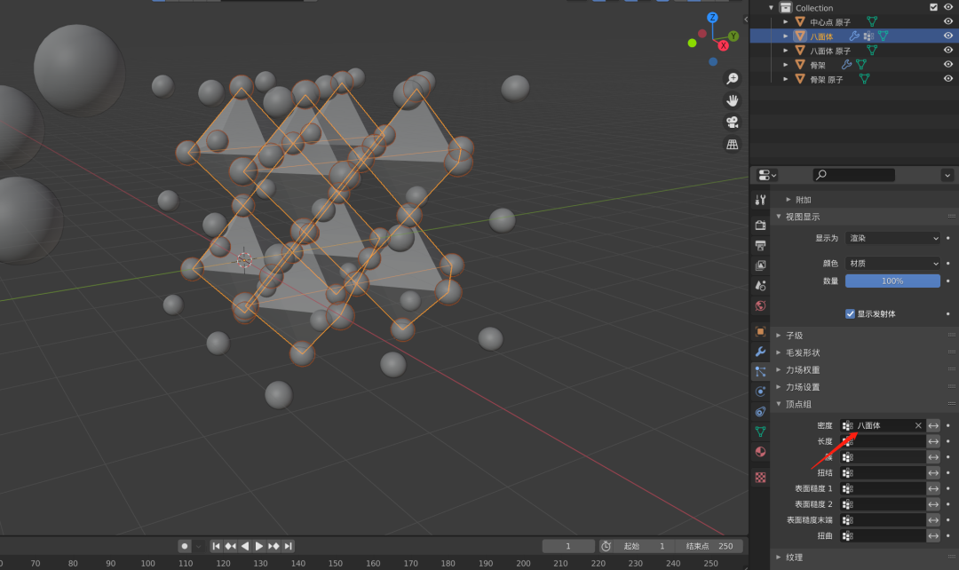 然后继续选择八面体,在其顶点组-密度中选择‘八面体’,这就是最初我们设置的那些点,意思就是让‘八面体原子’复制到八面体的顶点位置